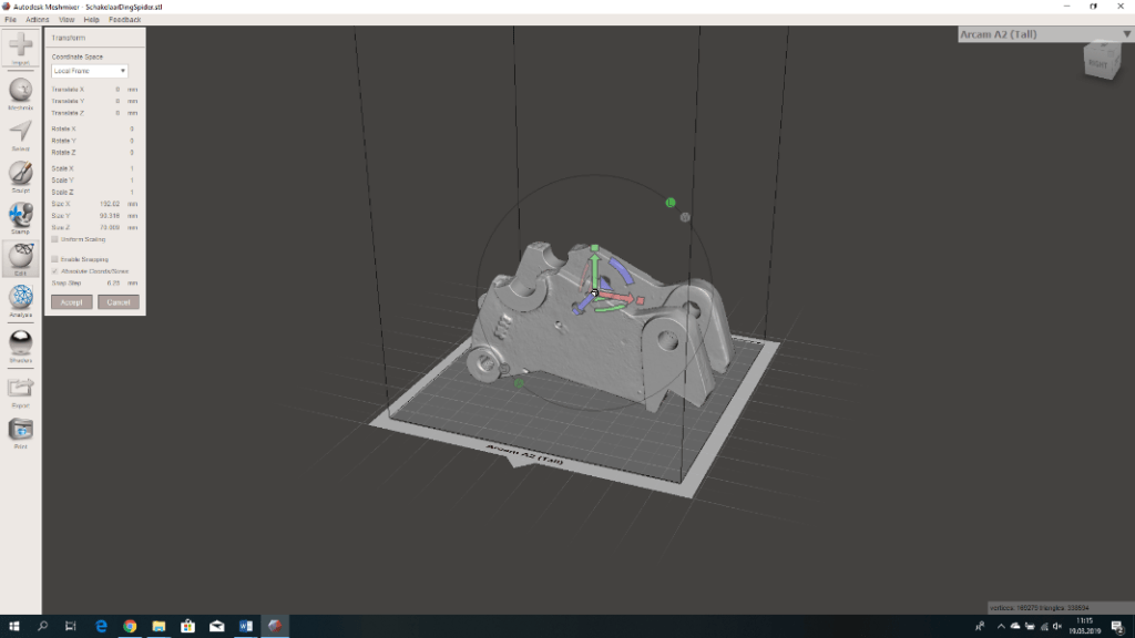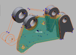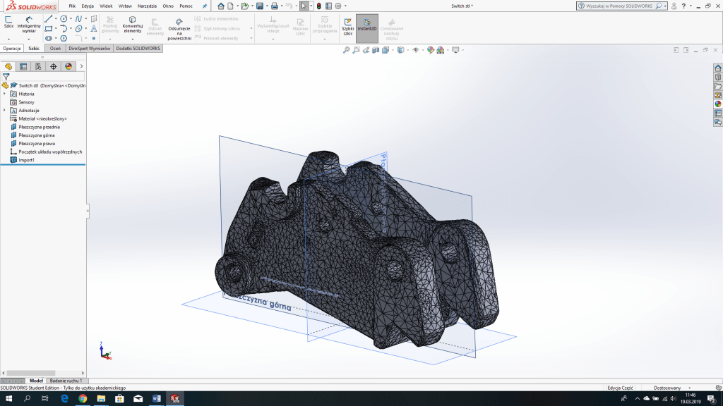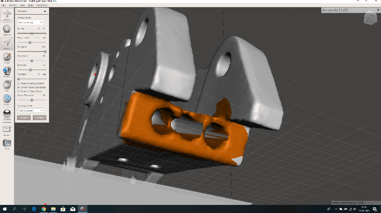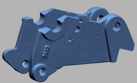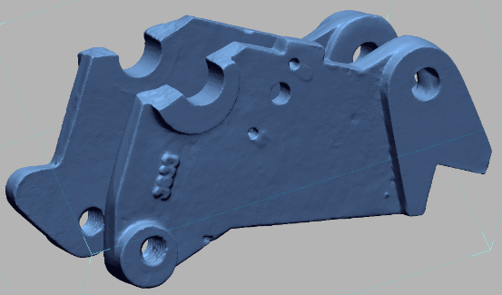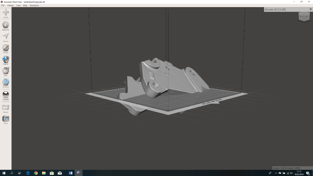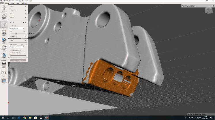 In Meshmixer the scanned object was placed in the correct orientation. The mesh was then reduced (via EDIT> REDUCE) to less than 20,000 polygons and then exported to STL. Now it is possible in SolidWorks or another CAD program to draw the broken part and give the holes the desired size. The object must then be meshed again in Meshmixer, because details may have been lost as shown in the holes in Figure 38. Here the quality of the mesh has been increased locally.
